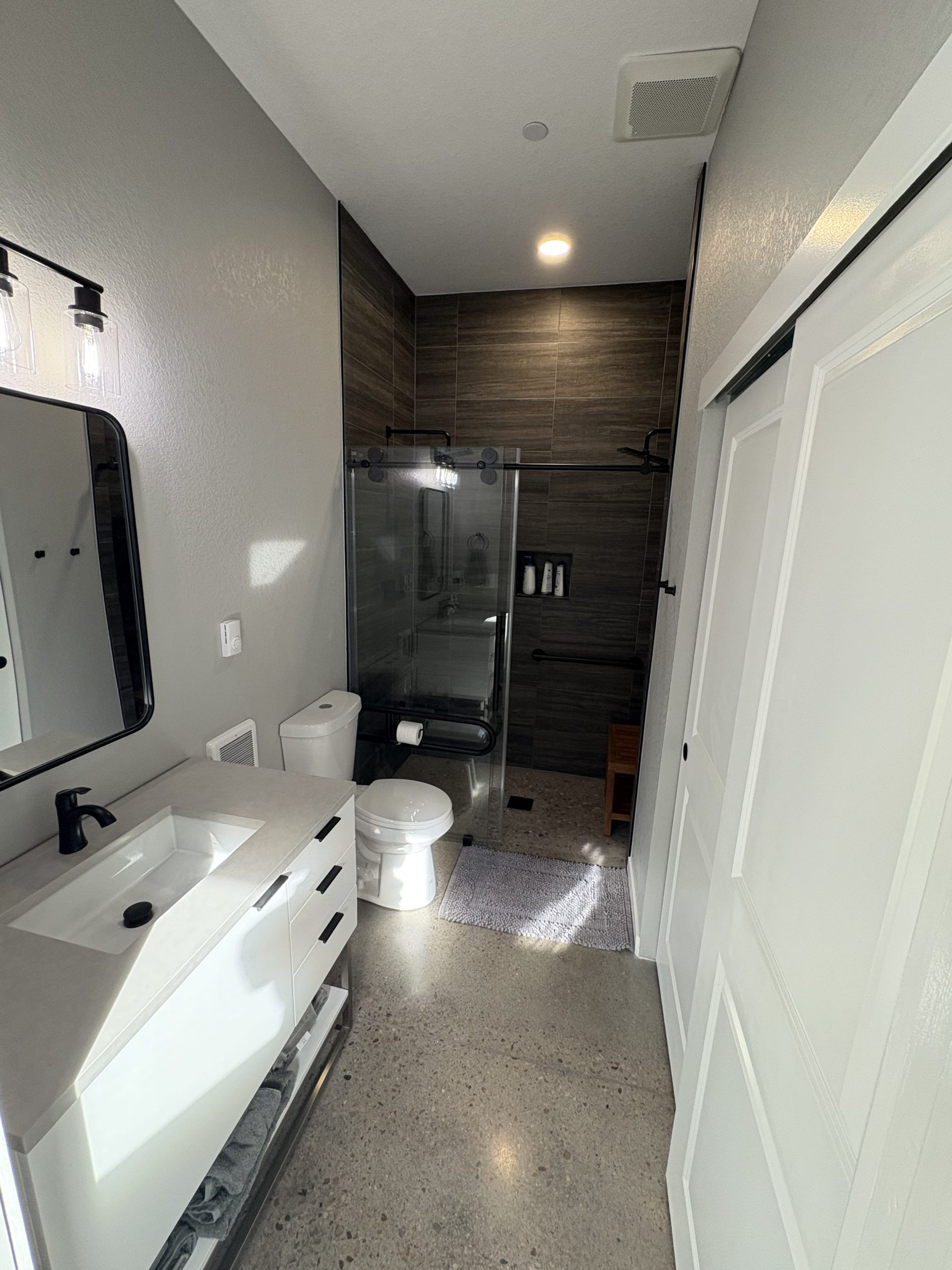 A stylish and functional 795 SF ADU designed for both comfort and accessibility. This 2-bedroom, 1-bathroom space features polished concrete floors, a zero-entry shower, and an expansive 264 SF deck. The 12-ft bifold doors create a seamless indoor-outdoor experience, perfect for a relaxing getaway.